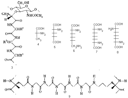 Смешанный биополимер, построенный из полисахаридных цепей и коротких пептидных фрагментов (высокомолекулярный гликопептид), составляет основу структуры стенки бактериальной клетки. Его полисахаридные цепи собраны из правильно чередующихся β -1 à 4-связанных остатков N-ацетил-D-глюкозамина (1) и N-ацетил-мурамовой кислоты (2). Последняя представляет собой простой эфир N-ацетил-D-глюкозамина (по положению 3) и молочной (L- α -оксипропионовой) кислоты.