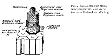 Типичная стенка растительной клетки (рис. 7) состоит из нескольких слоев. В ней различают первичную стенку, составляющую наружный слой клетки, и вторичную стенку, состоящую из внутреннего, среднего и внешнего слоев. В первичной стенке микрофибриллы не имеют определенной ориентации и переплетены в беспорядочную сеть. Во внешнем слое вторичной стенки они образуют два семейства параллельных линий, пересекающихся почти под прямым углом и образующих, таким образом, правильную («декартову») сетку. В среднем слое вторичной стенки микрофибриллы параллельны друг другу и почти параллельны оси цилиндра (фигуры, в грубом приближении
