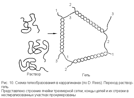 В свете этих данных образование трехмерной сетки из линейных молекул каррагинана, обусловливающей гелеобразование, трактуется следующим образом. В сильно разбавленном растворе (или при достаточно высокой температуре), когда межмолекулярные взаимодействия малы, форма цепей аппроксимируется конформацией беспорядочного клубка. В более концентрированных растворах (или при охлаждении) начинается образование двойных спиралей, связывающих участки разных молекул. Некоторая произвольно выбранная (и достаточно длинная) молекула может при этом образовывать несколько таких участков связывания и не с одной, а с несколькими молекулами. Тогда возникают нековалентные поперечные сшивки, и создается трехмерная сетка (рис. 10).
