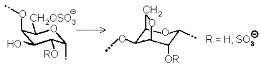 Прочность геля и содержание в нем воды (зависящее от средних размеров ячеек) определяется в основном двумя параметрами: длиной спирализуемых и длиной неспирализуемых участков, т.е. распределением различных остатков вдоль цепи. Здесь уместно заметить, что «деспирализующие» остатки 14 и 15 являются биохимическими предшественниками 3,6-ангидрозвеньев 12 и 13. Дело в том, что биосинтез полисахаридов типа каррагинанов включает, по-видимому, сульфатирование регулярной незамещенной цепи типа …-A-B-A-B-A-B-… и замыкание ангидрозвеньев по схеме: