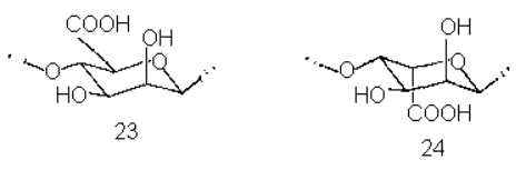 В других гелеобразующих полисахаридных системах могут быть иные (и весьма разнообразные) механизмы связывания макромолекул в узлах сетки; однако характер требований к ковалентной струкуре, соблюдение которых обеспечивает выполнение обусловленных гелеобразованием функций, оказывается сходным. Так, например, в гелях альгинатов, т.е. солей альгиновой кислоты, построенной из 1 à 4-связанных остатков β -D-маннуроновой (23) и α -L-гулуроновой (24) кислот, узлы образованы кристаллитами – правильным образом упакованными участками разных молекул с регулярной структурой, подобными по упаковке кристаллическим участкам элементарных фибрилл целлюлозы. Как мы уже говорили, цепи альгиновых кислот построены по блочному принципу: в них чередуются сегменты регулярной структуры из остатков одного типа с сегментами, в которых остатки обоих типов распределены более или менее случайно. Регулярные участки, подобно целлюлозе, имеют стержнеобразную конформацию и потому способны ассоциировать в кристаллиты, а для нерегулярных участков правильная упаковка невозможна, и они образуют в сетке промежутки между узлами.