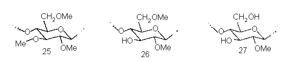 Еще один интересный гелеобразователь практического значения – частично метилированная целлюлоза, часто называемая «метилцеллюлозой». По мономерному составу это производное характеризуется случайным распределением метильных групп: в нем есть остатки и три-О-метил-глюкозы 25, и ди-О-метил-глюкоз (например, 26), и моно-О-метил-глюкоз (например, 27), и неметилированные остатки глюкозы. Онако по условиям получения частично метилированная целлюлоза характеризуется блочным строением. Дело в том, что ее синтез выполняют путем обработки нерастворимого целлюлозного материала хлористым метилом и водной щелочью. При этом происходит сильное набухание и затем интенсивное метилирование аморфных участков микрофибрилл, тогда как фрагменты молекул, находящиеся в кристаллических участках, почти недоступны для реагентов и остаются интактными. В результате в получающемся производном чередуются сегменты цепей, характеризующихся высокими степенями метилирования, с сегментами, не метилированными совсем (или очень незначительно метилированными).