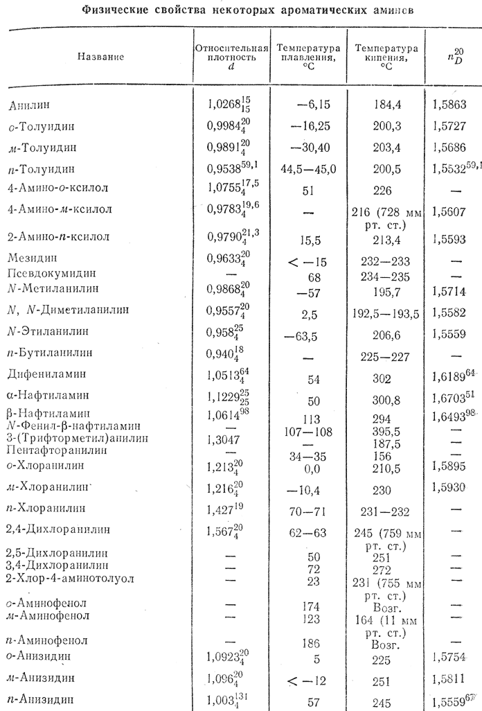Аминосоединения, содержащие аминогруппу в кольце, — значительно менее сильные основания, чем амины жирного ряда и аммиак. Со слабыми кислотами, например с угольной, они солей не образуют; соли сильных кислот в водном растворе вследствие гидролиза имеют кислую реакцию. Реакции анилина и его гомологов, как первичных, так и вторичных аминов, в большинстве аналогичны реакциям первичных и вторичных аминов жирного ряда. При взаимодействии с HNO2 первичные ароматические амины образуют сравнительно устойчивые при низких температурах диазосоединения. Для первичных ароматических аминов характерна также реакция ацилирования, т. е. замещения водорода аминогруппы остатком карбоновой кислоты. Аминосоединения легко окисляются; при этом получаются хиноны или их производные; восстановление происходит с трудом.