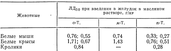 При 40-минутном отравлении минимальная концентрация м-толуидина, действующая на центральную нервную систему кроликов, 0,04 мг/л, а минимальная доза, действующая при контакте с кожей, 2—4 мг/кг (Закабунина).