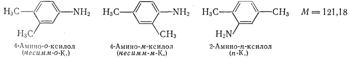 Физические и химические свойства. Кристаллические (о-ксилидин) или жидкие продукты (п-ксилидин, м-ксилидин), темнеющие на воздухе. Ограниченно растворимы в воде. Горят и образуют взрывоопасные паровоздушные смеси. Обладают основными свойствами. Состав технического продукта: 40—60% м-ксилидина, 10—20% п-ксилидина, остальное — прочие изомеры.