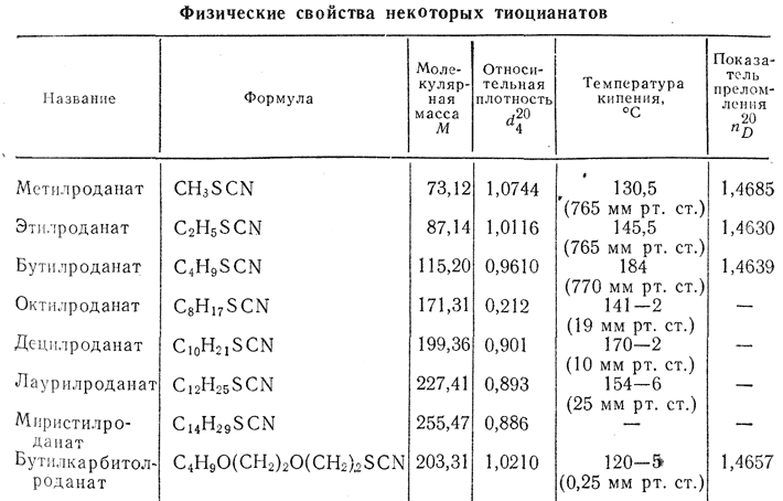 Физические и химические свойства. Бесцветные жидкости с эфирным запахом или твердые продукты. Не растворяются в воде. См. также таблицу. Разлагаются щелочами с образованием органических сульфидов и цианидов.