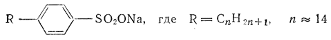 Получается сульфированием керилбензола (продукта алкилироваиия бензола хлорированным керосином) при помощи моногидрата или олеума.