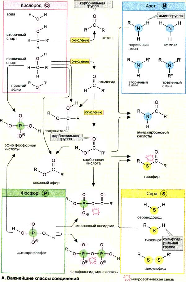 Подавляющее большинство биомолекул являются производными более простых соединений четырех химических элементов-неметаллов: кислорода (О), азота (N), серы (S) и фосфора (P). Многие биохимически важные соединения кислорода, азота и серы могут рассматриваться как производные водорода (Н2О, NH3, H2S). В биологических системах фосфор встречается главным образом в форме производных фосфорной кислоты H3PO4.