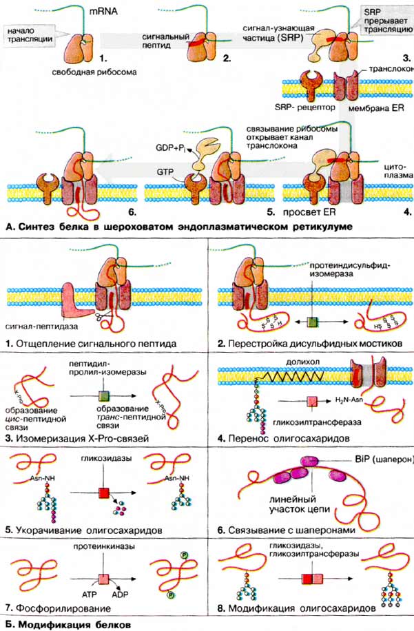 Модификации в ШЭР. Превращение линейной немодифицированной пептидной цепи в полноценный функциональный белок (созревание) осуществляется в результате многостадийного процесса, который начинается сразу же после начала трансляции и протекает в просвете ЭР.