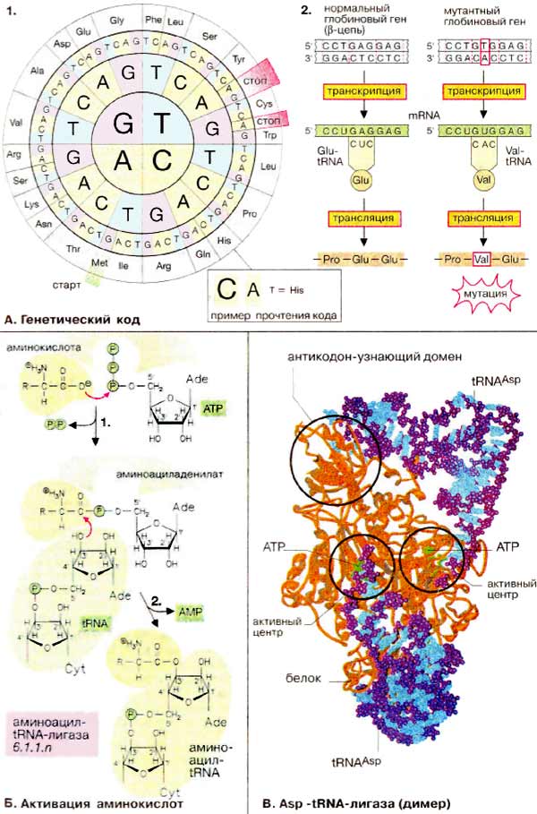 В качестве примера прочтения кода на схеме 2 показаны короткие участки нормального и мутантного гена β-глобина вместе с соответствующими последовательностями мРНК и аминокислот. Здесь показаны относительно часто встречающиеся точковые мутации, в результате которых остаток глутаминовой кислоты в положении 6 β-цепи заменен на валин. Такой мутантный гемоглобин в дезоксиформе склонен к агрегации, что вызывает деформацию эритроцитов и уменьшает эффективность транспорта кислорода (серповидноклеточная анемия).