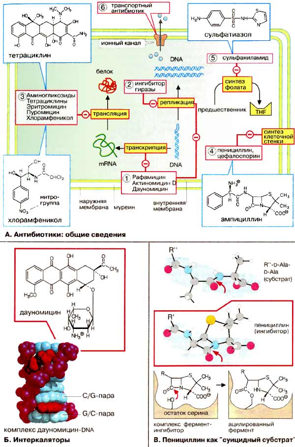 На схеме показаны некоторые из наиболее важных а терапевтическом отношении антибиотиков и места их действия в бактериальном метаболизме. Так называемые интеркаляторы, например рифамицин и актиномицин D, встраиваются в двойную спираль ДНК и тем самым препятствуют репликации и транскрипции. Поскольку ДНК имеет в основном одинаковую структуру во всех клетках, интеркаляторы токсичны и для эукариот, поэтому их применение в качестве цитостатиков ограниченно только вполне определенными случаями. Синтетические ингибиторы ДНК-топоизомеразы II, так называемые ингибиторы гираз, воздействуют на репликацию и тем самым подавляют репродукцию бактерий. Большая группа антибиотиков является ингибиторами трансляции (3), т. е. воздействует на рибосомы. К этой группе относятся тетрациклины — антибиотики широкого спектра действия, активные в отношении возбудителей многих заболеваний. Аминогликозиды (из которых наиболее известен стрептомицин) воздействуют на все фазы трансляции. Эритромицин нарушает нормальную функцию большой рибосомной субчастицы, в то время как хлорамфеникол, одно из немногих природных нитросоединений, ингибирует пептидилтрансферазу. Наконец, пуромицин имитирует аминоацил-тРНК, вызывая тем самым преждевременную терминацию элонгации. Группа β-лактамных антибиотиков (4, на схеме справа внизу), наиболее известными представителями которой являются пенициллины и цефалоспорины, продуцируется плесенью рода Penicillium. Для них характерно наличие в структуре реакционноспособного β-лактамного кольца. Наиболее часто эти антибиотики используются для подавления грамотрицательных микроорганизмов, у которых они ингибируют синтез клеточных стенок (схема В). Первыми полностью синтетическими антибиотиками были сульфаниламиды (на схеме справа вверху). Они являются аналогами п-аминобензойной кислоты и воздействуют на синтез фолиевой кислоты, предшественника кофермента ТГФ (см. с. 110). Транспортные антибиотики (на схеме в центре вверху) действуют подобно ионным каналам. Их встраивание в цитоплазматическую мембрану ведет к потере ионов, что вызывает гибель бактериальных клеток.