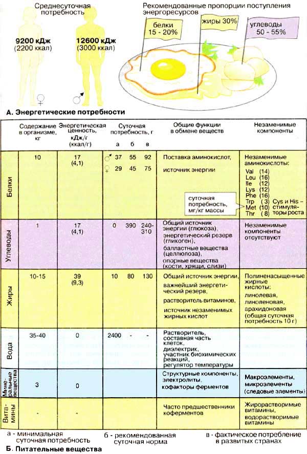 Энергетические потребности организма человека зависят от возраста, пола, массы, состояния здоровья и физической активности. При этом рекомендуется, чтобы примерно половина суточного энергообеспечения поступала в виде углеводов, не более трети с жирами, а остальное с белками.