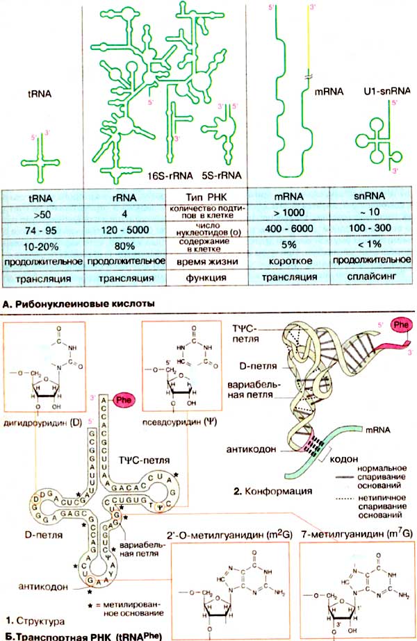 РНК принимают участие во всех стадиях процесса генной экспрессии и биосинтеза белка. Свойства наиболее важных видов РНК приведены в таблице. Кроме того, здесь схематически показаны вторичные структуры молекул РНК.