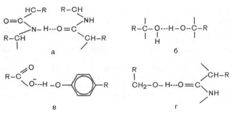 В белковой молекуле наиболее важные водородные связи образуются между ковалентно связанным атомом водорода, несущим частичный положительный заряд, и отрицательно заряженным ковалентно связанным атомом кислорода. Ниже представлены примеры водородных связей в белковой молекуле: а) между пептидными цепями; б) между двумя гидрок-сильными группами; в) между ионизированной СООН-группой и ОН-груп-пой тирозина; г) между ОН-группой серина и пептидной связью.