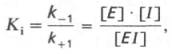 Образовавшийся комплекс, называемый фермент-ингибиторным комплексом ЕI, в отличие от фермент-субстратного комплекса ES не распадается с образованием продуктов реакции. Константу диссоциации комплекса EI, или ингибиторную константу Кi, можно, следуя теории Михаэлиса–Мен-тен, определить как отношение констант обратной и прямой реакций: