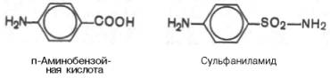 ферментов бактерий. Благодаря этому структурному сходству сульфаниламид блокирует действие фермента путем вытеснения парааминобензой-ной кислоты из комплекса с ферментом, синтезирующим фолиевую кислоту, что ведет к торможению роста бактерий.