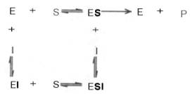 Следует указать, что неконкурентное ингибирование также может быть обратимым и необратимым, поскольку отсутствует конкуренция между субстратом и ингибитором за активный центр. Примеры необратимого ингибирования приведены ранее. При обратимом неконкурентном ингибировании субстрат S и ингибитор I связываются с разными центрами, поэтому появляется возможность образования как комплекса EI, так и тройного комплекса EIS; последний может распадаться с освобождением продукта, но с меньшей скоростью, чем комплекс ES.