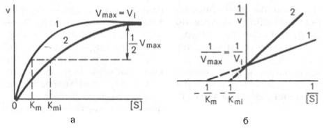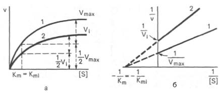 а - в координатах v от [ S ] ; б - в координатах 1/v от 1 / [ S ] ; Vmaxи Vi - максимальные скорости реакции; Кm и Kmi - константа Михаэлиса соответственно в отсутствие (1) и в присутствии (2) ингибитора.