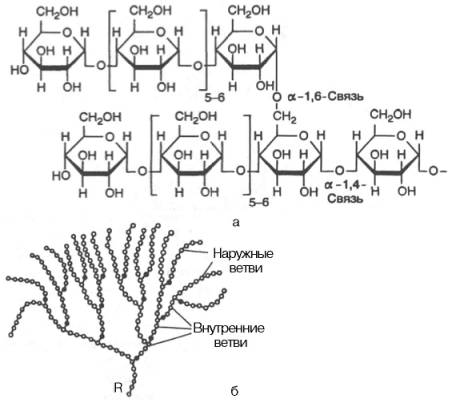 Гликоген характеризуется более разветвленной структурой, чем амило-пектин; линейные отрезки в молекуле гликогена включают 11–18 остатков α-D-глюкопиранозы.