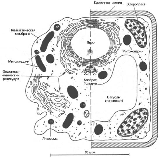 Рис. 9.1. Схематическое изображение животной (слева) и растительной (справа) клетки.
