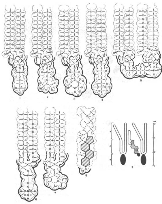 Рис. 9.2. Химические формулы распространенных липидов биологических мембран. 1 - фосфатидилэтаноламин; 2 - фосфатидилсерин; 3 - фосфатидилинозит; 4 - фосфатидилхолин; 5 - кардиолипин; 6 - сфингомиелин; 7 - цереброзид; 8 - холестерин; 9 - расположение молекулы холестерина между двумя молекулами фосфолипидов: а - наименее упорядоченная область бислоя, б - область, упорядочиваемая холестерином, в - область полярных «голов». Красным отмечены полярные области молекул.