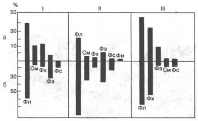 Рис. 9.3. Распределение липидов между наружной (а) и внутренней (б) сторонами бислоя в мембранах эритроцитов (I), вируса гриппа (II) и саркоплазматического ретикулума кролика (III). Фл - общие фосфолипиды; Фх - фосфатидилхолин; Фэ - фосфатидилэтаноламин; Фс - фосфати-дилсерин; См - сфингомиелин; Фи - фосфатидилинозит.