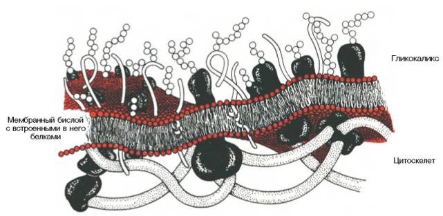 Участки белка, которые обращены во внеклеточную среду, могут подвергаться гликозилированию. В мембранах растений и бактерий полисахара играют самостоятельную роль, образуя наружную оболочку. В клетках животных, в которых наружный слой включает углеводы, имеется внутренний цитоскелет, состоящий из актина и других легко полимеризующихся белков; он имеет регулярную связь с мембранными белками и выполняет формообразующую и опорную функцию (рис. 9.4).