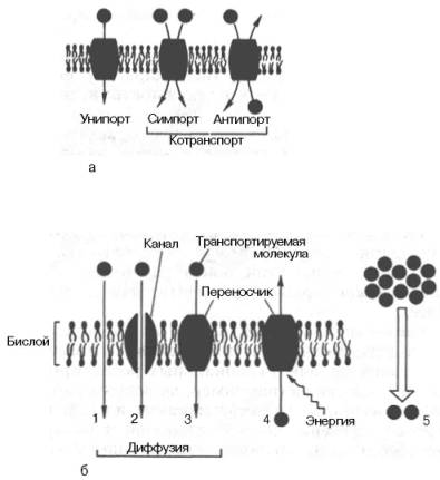 Рис. 9.5. Перенос веществ через мембрану. а - виды переноса; б - пассивный и активный транспорт: 1 - пассивная диффузия; 2 - диффузия с помощью канала; 3 - диффузия с помощью переносчика; 4 - активный транспорт; 5 - вторично-активный транспорт.