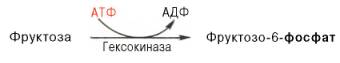 Фруктоза. Установлено, что фруктоза, присутствующая в свободном виде во многих фруктах и образующаяся в тонкой кишке из сахарозы, всасываясь в тканях, может подвергаться фосфорилированию во фруктозо-6-фосфат при участии фермента гексокиназы и АТФ: