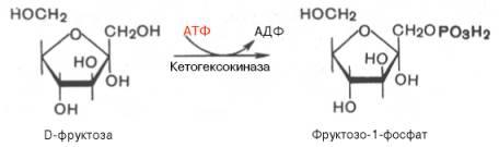 В печени, однако, для этого существует другой путь. В ней имеется фермент фруктокиназа, который катализирует фосфорилирование фруктозы не по 6-му, а по 1-му атому углерода: