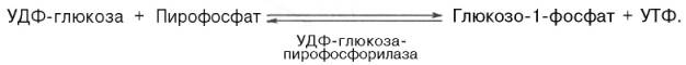 Затем УДФ-глюкоза-пирофосфорилаза катализирует расщепление УДФ-глюкозы с образованием глюкозо-1-фосфата: