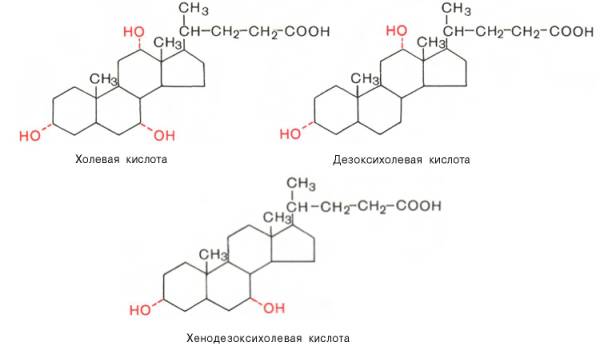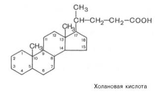 В желчи человека в основном содержатся холевая (3,7,12-триоксихола-новая), дезоксихолевая (3,12-диоксихолановая) и хенодезоксихолевая (3,7-диоксихолановая) кислоты (все гидроксильные группы имеют α-конфи-гурацию и поэтому обозначены пунктирной линией):
