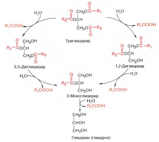 Гидролиз триглицеридов при участии панкреатической липазы можно изобразить в виде следующей схемы: