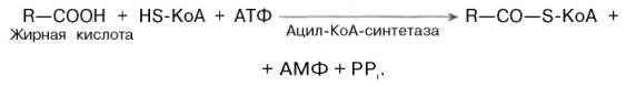 Активация жирных кислот. Свободная жирная кислота независимо от длины углеводородной цепи является метаболически инертной и не может подвергаться никаким биохимическим превращениям, в том числе окислению, пока не будет активирована. Активация жирной кислоты протекает на наружной поверхности мембраны митохондрий при участии АТФ, коэнзима A (HS-KoA) и ионов Mg2+. Реакция катализируется ферментом ацил-КоА-синтетазой: