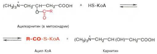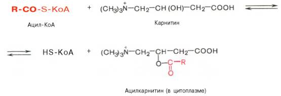 с длинной цепью через внутреннюю митохондриальную мембрану служит карнитин. Ацильная группа переносится с атома серы КоА на гидроксильную группу карнитина с образованием ацилкарнитина, который диффундирует через внутреннюю митохондриальную мембрану: