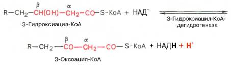 Вторая стадия дегидрирования. Образовавшийся β-оксиацил-КоА (3-гидроксиацил-КоА) затем дегидрируется. Эту реакцию катализируют НАД+-зависимые дегидрогеназы: