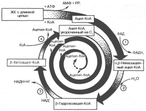 1 - ацил-КоА-дегидрогеназа (КФ 1.3.99.3) ; 2 - еноил-КоА-гидратаза (КФ 4.2.1.17.); 3 - β-гидро-ксиацил-КоА-дегидрогеназа (КФ 1.1.1.35); 4 - тиолаза (КФ 2.3.1.9).