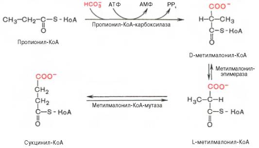 Как отмечалось, основная масса природных липидов содержит жирные кислоты с четным числом углеродных атомов. Однако в липидах многих растений и некоторых морских организмов присутствуют жирные кислоты с нечетным числом атомов углерода. Кроме того, у жвачных животных при переваривании углеводов в рубце образуется большое количество про-пионовой кислоты, которая содержит три углеродных атома. Пропионат всасывается в кровь и окисляется в печени и других тканях. Установлено, что жирные кислоты с нечетным числом углеродных атомов окисляются таким же образом, как и жирные кислоты с четным числом углеродных атомов, с той лишь разницей, что на последнем этапе расщепления (β-окисления) образуется одна молекула пропионил-КоА и одна молекула ацетил-КоА, а не 2 молекулы ацетил-КоА.
