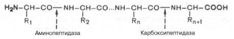 Точкой приложения аминопептидазы является пептидная связь с N-кон-ца пептида. Карбоксипептидаза разрывает пептидную связь с противоположного С-конца пептида. Эти ферменты отщепляют по одной аминокислоте от полипептида.