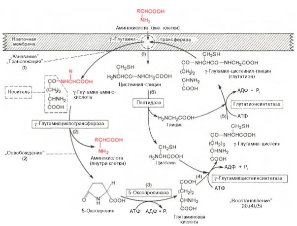 гает реакцию расщепления комплекса вправо. Благодаря возможности ресинтеза глутатиона, требующего затраты энергии АТФ, цикл может повторяться многократно, транспортируя значительные количества аминокислот.