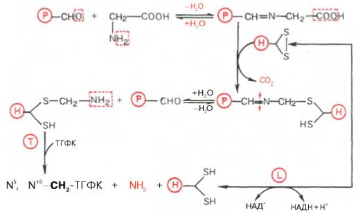 Механизм этой реакции, недавно раскрытый К. Тада, включает участие митохондриальной глицинрасщепляющей ферментной системы, отличной от глицинсинтазы и состоящей из 4 белков: Р-белка, содержащего пиридоксальфосфат (глициндекарбоксилаза); Н-белка, содержащего липое-вую кислоту; Т-белка, требующего присутствия ТГФК, и L-белка, названного липамиддегидрогеназой: