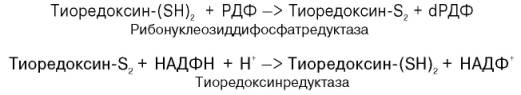 Химический смысл превращения рибонуклеотидов в дезоксирибо-нуклеотиды сводится к элементарному акту – восстановлению рибозы в 2-дезоксирибозу, требующему наличия двух атомов водорода. Непосредственным источником последних оказался восстановленный термостабильный белок тиоредоксин, содержащий две свободные SH-группы на 108 аминокислотных остатков. Тиоредоксин легко окисляется, превращаясь в дисульфидную S-S-форму. Для его восстановления в системе имеется специфический ФАД-содержащий фермент тиоредоксинредуктаза (мол. масса 68000), требующая наличия восстановленного НАДФН. Обозначив условно рибонуклеозиддифосфат РДФ, образование дезоксирибонуклеотидов можно представить следующим образом: