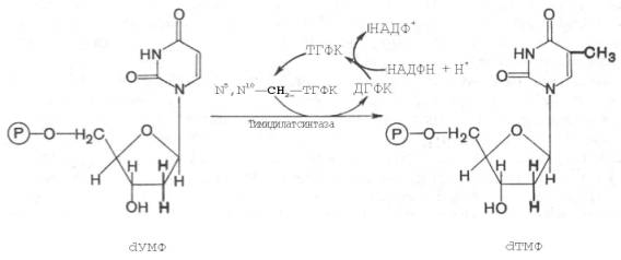 Донором метильной группы в тимидилатсинтазной реакции является N5,N10-метилен-ТГФК, которая одновременно отдает и водородный протон, поэтому одним из конечных продуктов реакции является не тетра-гидро-, а дигидрофолиевая кислота (ДГФК). Последняя вновь восстанавливается до ТГФК под действием НАДФН-зависимой дигидрофолат-редуктазы. Из образовавшегося ТМФ путем фосфотрансферазных реакций образуются dТДФ и dTТФ.