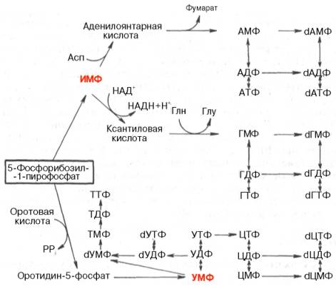 Далее на двух схемах суммированы данные о взаимопревращениях пуриновых и пиримидиновых нуклеотидов, а также о связи их с синтезом нуклеиновых кислот. Как видно из схем, в образовании пуриновых и пиримидиновых нуклеотидов специфическое участие принимает ФРПФ, являющийся донором фосфорибозильного остатка в биосинтезе как оро-тидин-5'-фосфата, так и ИМФ; последние считаются ключевыми субстратами в синтезе нуклеиновых кислот в клетках.