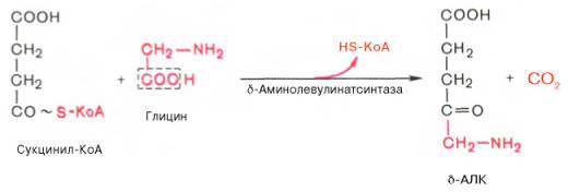 На I стадии, протекающей в 2 этапа, сукцинил-КоА взаимодействует с глицином и образованием δ-аминолевулиновой кислоты (δ-АЛК).