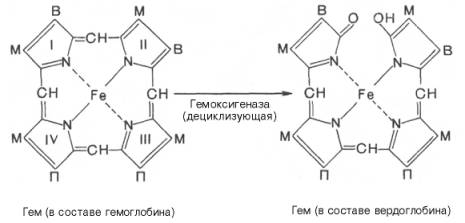 Продолжительность жизни эритроцитов составляет 120 дней, затем они разрушаются и освобождается гемоглобин. Главными органами, в которых происходят разрушение эритроцитов и распад гемоглобина, являются печень, селезенка и костный мозг, хотя в принципе оба процесса могут происходить и в клетках других органов. Распад гемоглобина в печени начинается с разрыва α-метиновой связи между I и II кольцами порфиринового кольца. Этот процесс катализируется НАДФ-содержащей ок-сидазой и приводит к образованию зеленого пигмента вердоглобина (холеглобина):