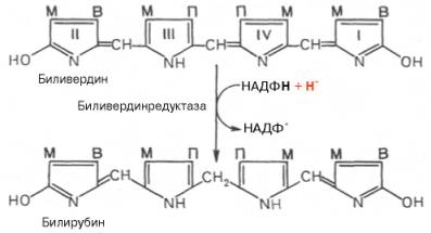 В приведенных структурных формулах здесь и далее в желчных пигментах М – метильная СН3-группа, В – (—СН=СН2) – винильная группа и П – (—СН2—СН2—СООН) – остаток пропионовой кислоты.