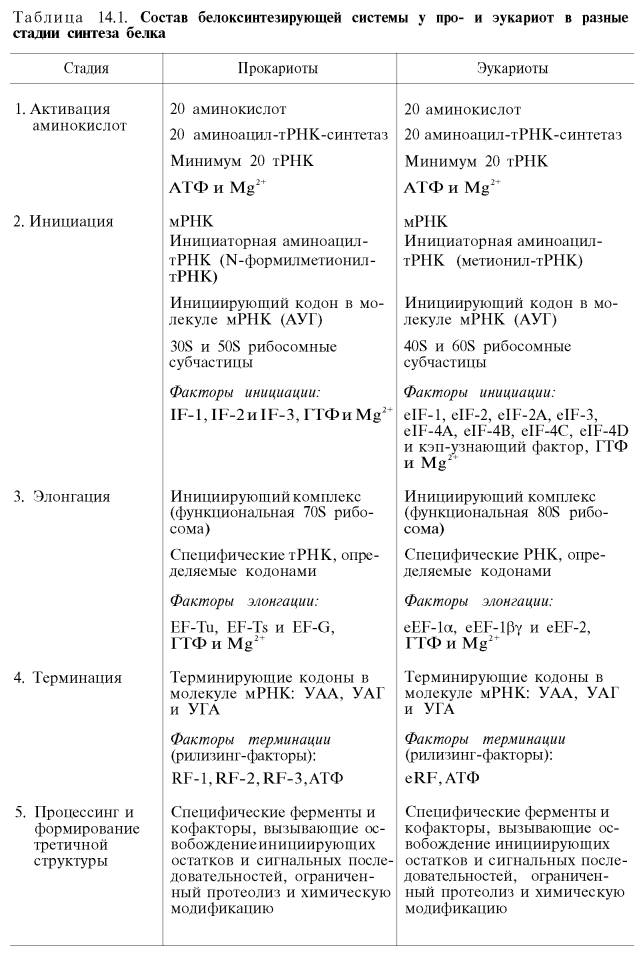 Белоксинтезирующая система включает набор всех 20 аминокислот, входящих в состав белковых молекул; минимум 20 разных тРНК, обладающих специфичностью к определенному ферменту и определенной аминокислоте; набор минимум 20 различных ферментов – аминоацил-тРНК-синтетаз, также обладающих двойной специфичностью к какой-либо определенной аминокислоте и к одной тРНК; рибосомы (точнее, полисомы, состоящие из 4–12 монорибосом с присоединенной к ним мРНК); АТФ и АТФ-генерирующую систему ферментов; ГТФ, принимающий специфическое участие в стадиях инициации и элонгации синтеза белка в рибосомах; ионы Mg2+в концентрации 0,005–0,008 М; мРНК в качестве главного компонента системы, несущей информацию о структуре белка, синтезирующегося в рибосоме; наконец, белковые факторы, участвующие в синтезе на разных уровнях трансляции. Основные компоненты белок-синтезирующей системы про- и эукариотов в разные стадии синтеза белка обобщены в табл. 14.1.