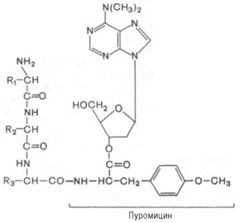 Один из мощных ингибиторов белкового синтеза – пуромицин. Он представляет собой аналог концевого участка аминоацил-тРНК адениловой кислоты и поэтому легко взаимодействует с А-центром пептидил-тРНК с образованием пептидил-пуромицина :