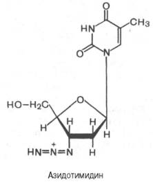 Одним из мощных ингибиторов синтеза вирусной РНК оказался азидотимидин (3'-азидо-2',3'-дидезокситимидин), синтезированный еще в 1964 г. в надежде на его противоопухолевый эффект. Было показано, что вирус иммунодефицита человека (ВИЧ) содержит РНК-й геном, в составе которого имеются как стандартные гены ретровирусов, так и необычные небольшие гены со множеством функций. Последние, в частности, подвержены мутациям с высокой скоростью вследствие низкой точности репликации, вызванной свойствами обратной транскриптазы. Эта вирусная обратная транскриптаза иммунодефицита человека оказалась наделенной значительно большим сродством к азидотимидину, чем к природному дезокситимидинтрифосфату (dTТФ). Азидотимидин конкурентно тормозит связывание dTТФ, вызывая тем самым терминацию (окончание) синтеза вирусной РНК.